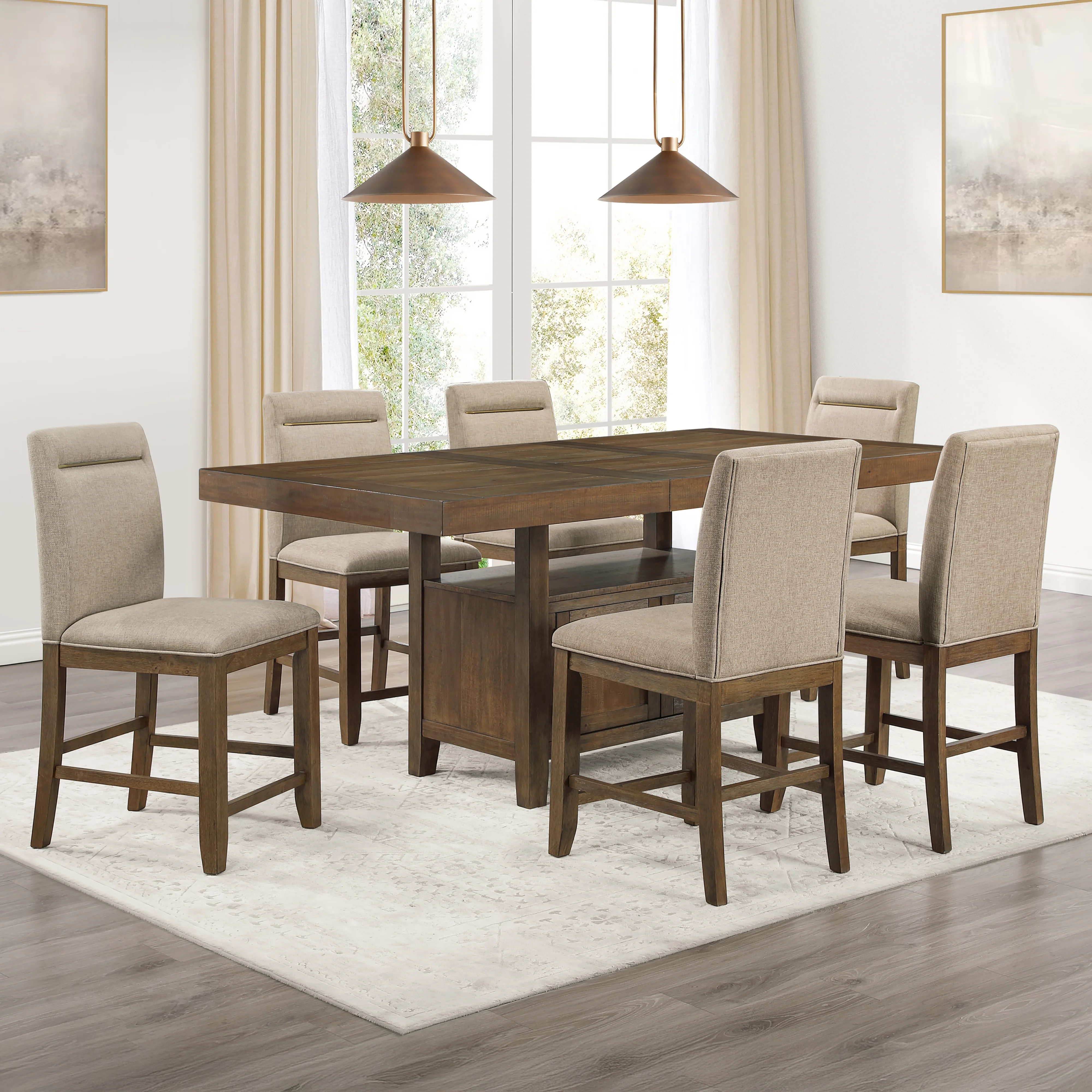 moreSophisticated yet relaxed, the Garland Counter Height 7-Piece Dining Set is designed to shine in any space. A distressed toffee finish complements its modern profile, creating a seamless blend of casual elegance. The 36"" counter height table offers a comfortable setting for both dining and standing work, while its faux plank top, enhanced with rasping and threading distressing, adds character and warmth. Paired with four fully upholstered counter chairs featuring tailored canvas covers and brushed brass accents, this set perfectly balances casual and formal elements for an inviting and stylish dining experience.
