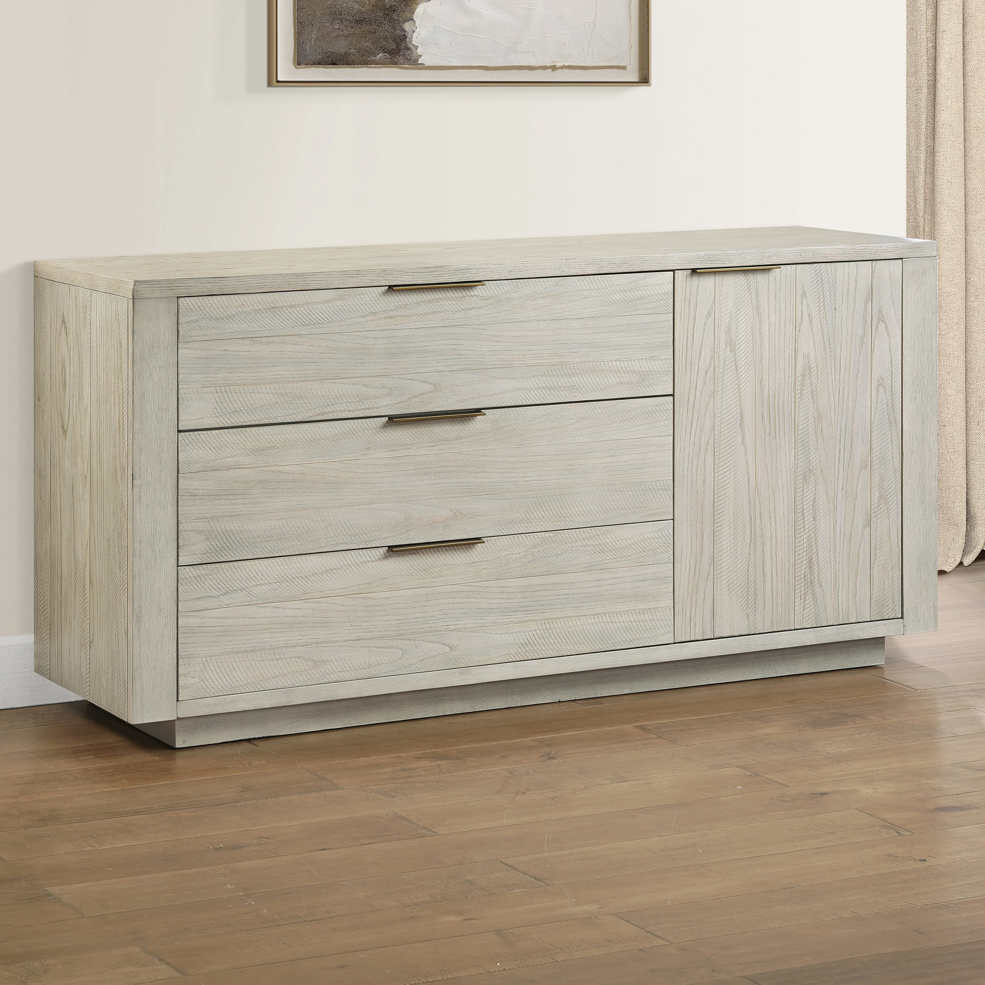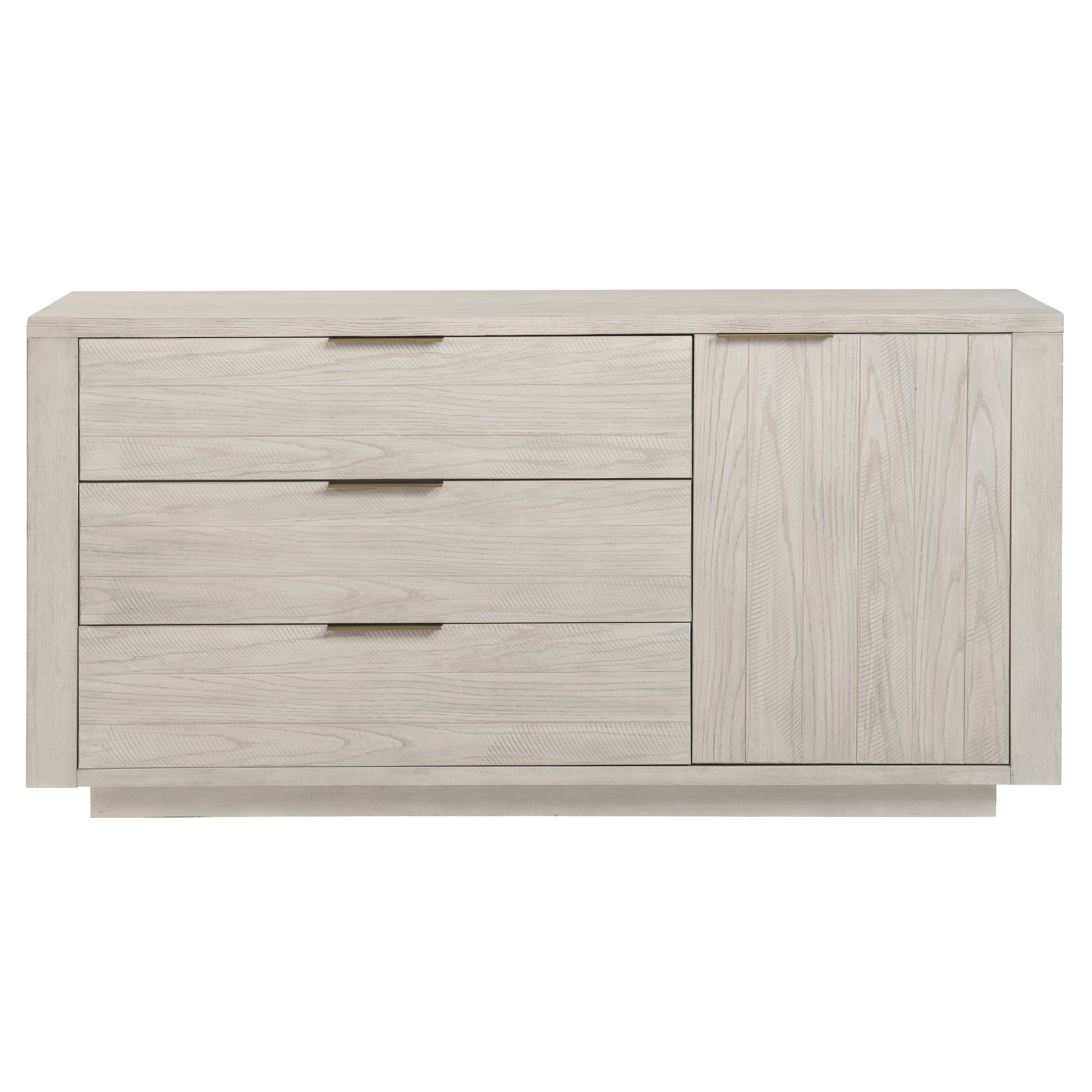moreThe Garland Server marries a modern silohuette with a relaxed, lightly distressed greige finish in a dining side piece with the perfect casually elegant style of today's dining rooms. A modern plinth base and tastefully appointed satin brass hardware creates extremely clean lines that displays the natural beauty of the wood expertly. Three drawers and a door allow for plenty of storage base of any dining area in a neat, beautiful package that can stand on its own or can be paired with the matching Garland dining collection.