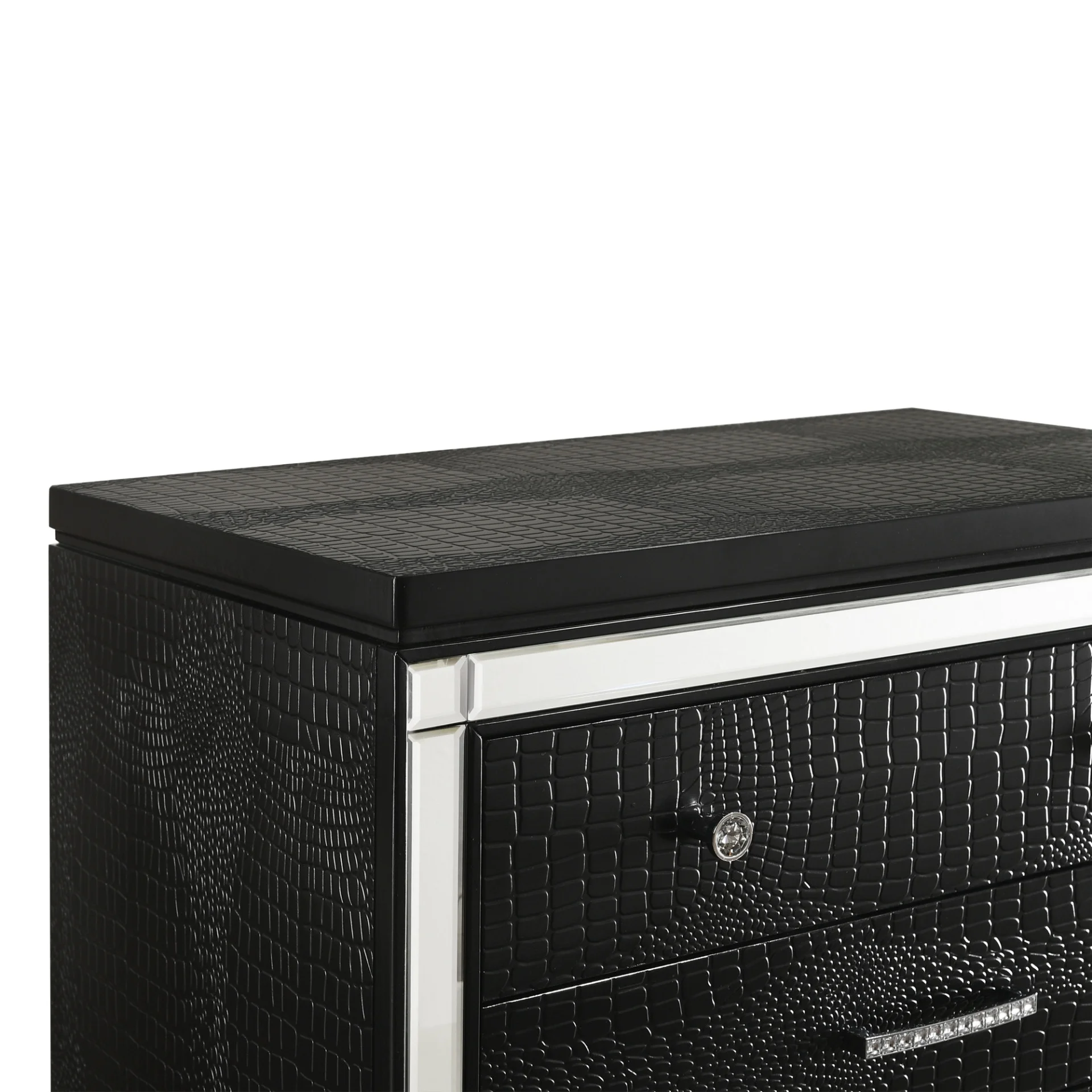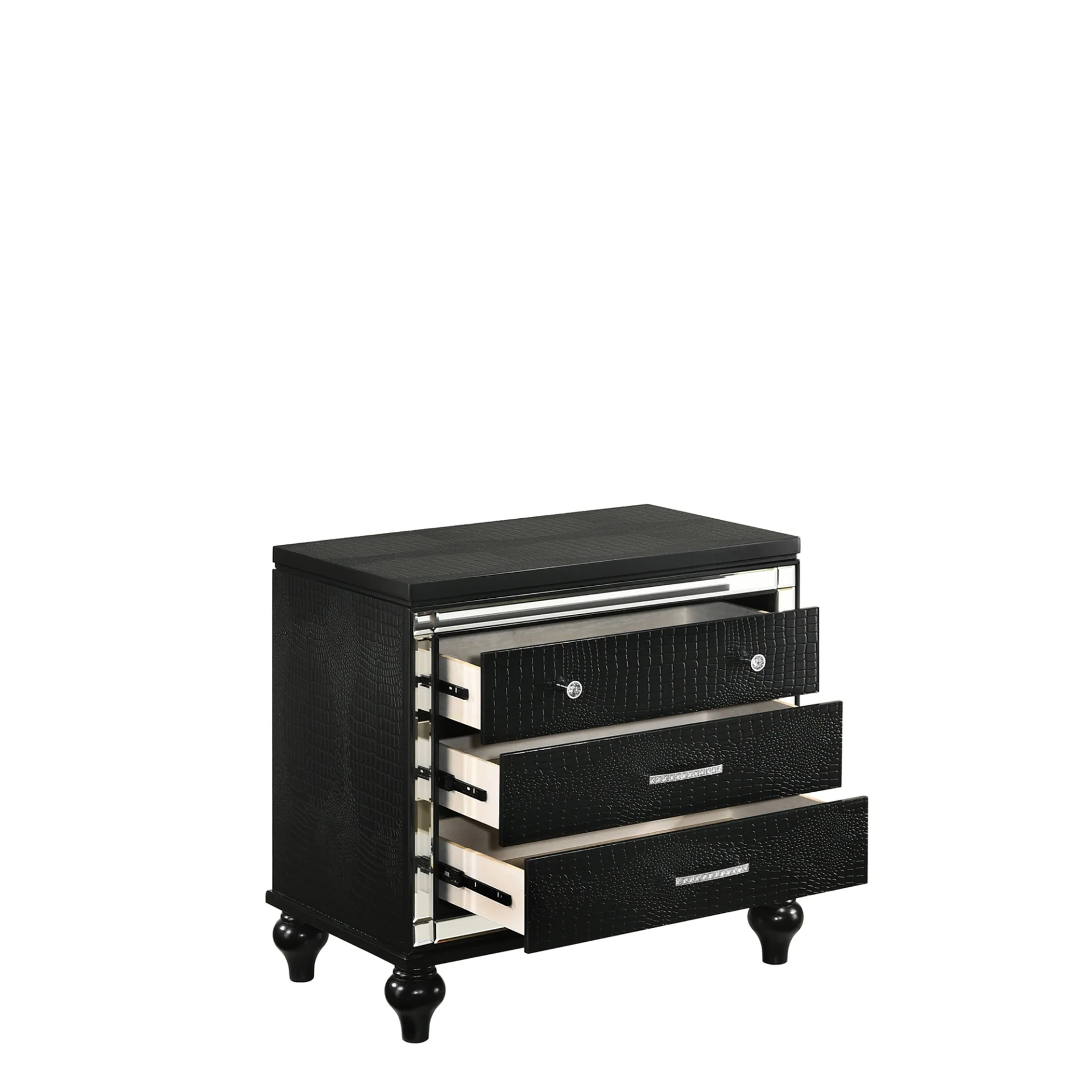 moreAdd stylish storage to your bedside with this three drawer nightstand. Turned feet, mirror accents, and the embossed inlay of this piece showoff its glam style. Crystal-like detailing adorns the drawer hardware.