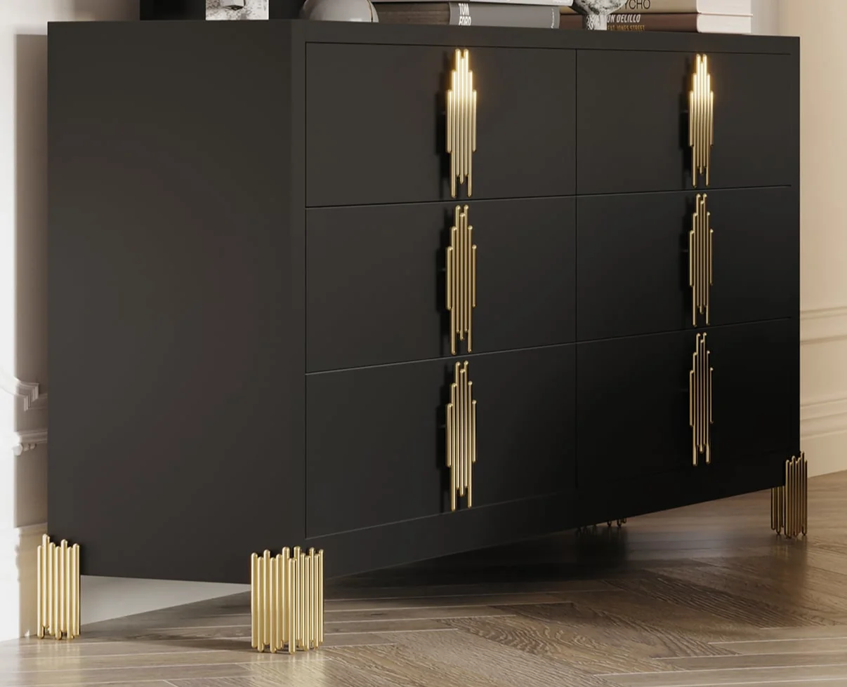 moreIntroducing the Empire 6 Drawer Dresser in sleek black, a timeless addition to your bedroom decor. Crafted with durable eco-friendly materials and a sophisticated finish, this dresser exudes contemporary elegance. Its gleaming gold drawer pulls and feet evoke the enchanting allure of a city skyline at night. Inside, the drawers are meticulously crafted with English dovetail joinery and ball bearing glides, ensuring smooth and reliable operation. Enhance your bedroom with the Empire 6 Drawer Dresser, where quality meets style for a truly captivating ambiance.