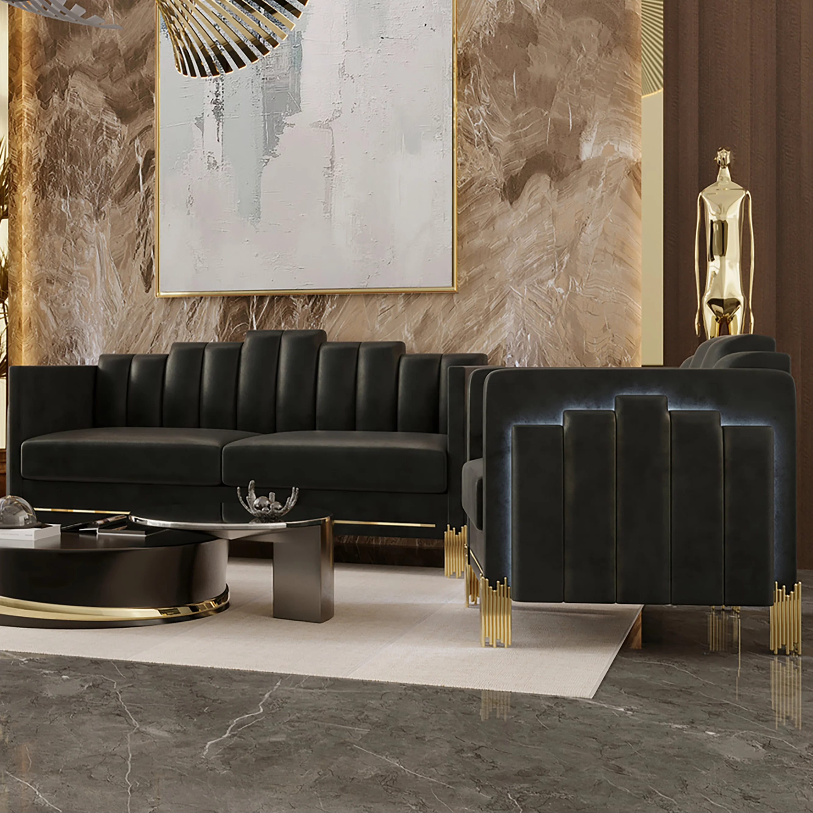 moreIntroducing the Empire Sofa, a durable and stylish addition to your living space. Crafted with an eco-friendly manufactured wood frame, this 3-seater couch ensures lasting strength and durability. Upholstered in luxurious 100% midnight black polyester velvet fabric, it adds a touch of sophistication to any room. The modern metro style, featuring tiered panels and gleaming gold accents, captures the enchanting ambiance of a city skyline under the stars. Experience added ambiance with blue LED accent light strips on the side panels, effortlessly controlled with the touch of a button. Enjoy supportive seating with high-density full foam cushions, providing resilient and comfortable support. Upgrade your living room with the Empire Sofa, where style meets durability for unparalleled comfort.