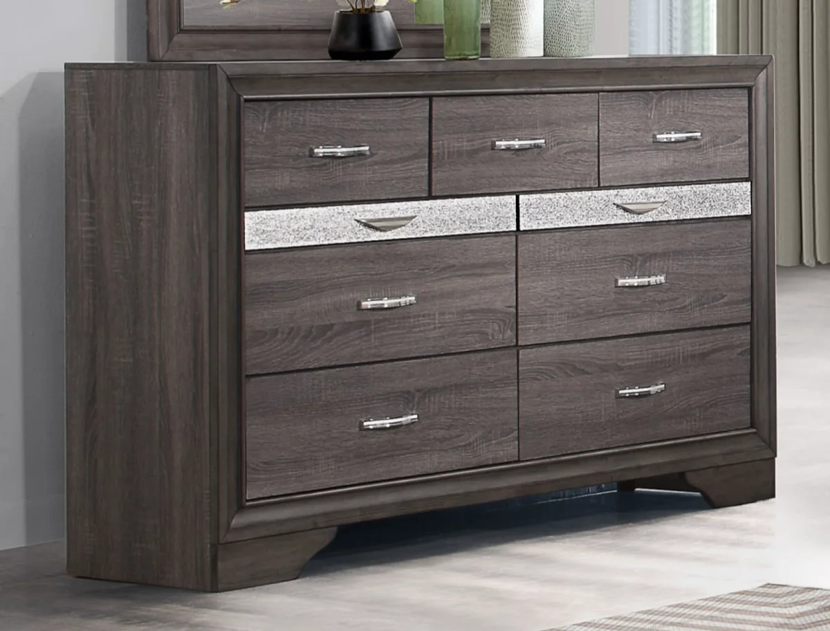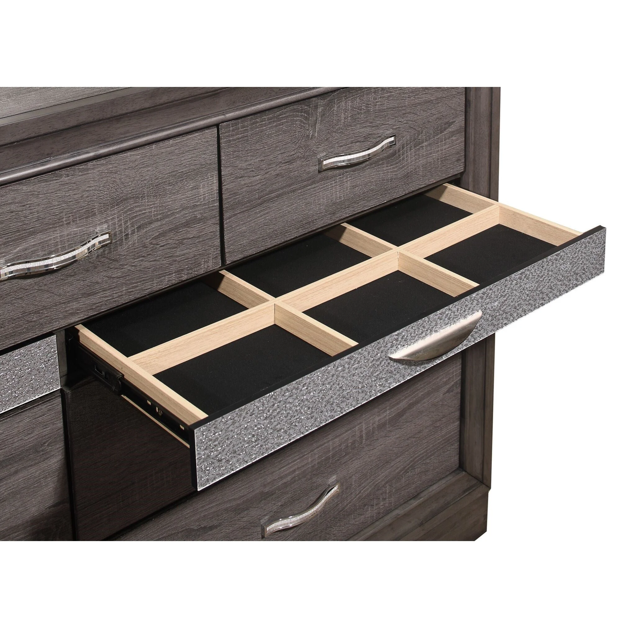 Visually stunning and elegant, the Seville Dresser fills a room with dynamic look and cozy appeal. Clean, modern design elements along with a fresh yet timeless look will transform your bedroom into a haven of serenity and style. Sold in a comfortable grey which make it a stress-free and easy way to coordinate countless room environments and décor choices. Features include roomy drawer space, silver-toned drawer front hardware, convenient jewelry drawers, and melamine detailing that enhance the graceful charm of this dresser. Quality craftsmanship in every detail ensures durability and long-lasting wear. The Seville dresser is the perfect solution in your quest to create a showcase of style and comfortable living in your home and will provide you with years of versatility and enjoyment.